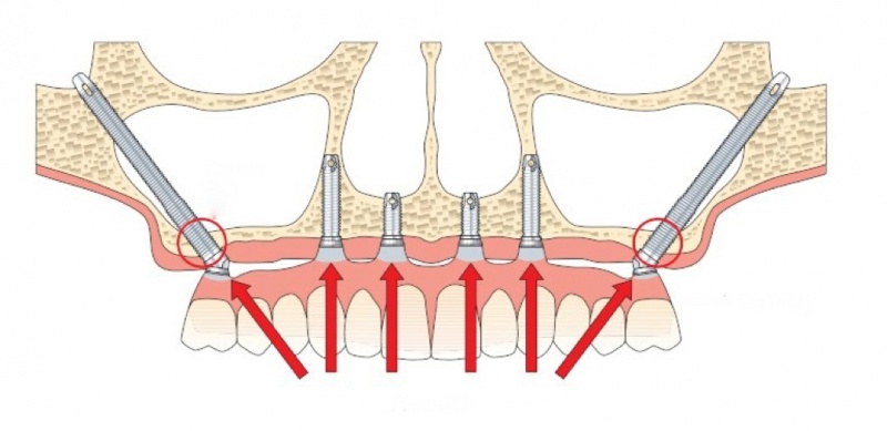 Heel vaak kan één zygoma-implant aan elke kant gecombineerd worden met reguliere implantaten in het gebied van de voortanden. In meer extreme gevallen worden langs elke zijde 2 zygoma implantaten geplaatst en worden eveneens dadelijk belast.