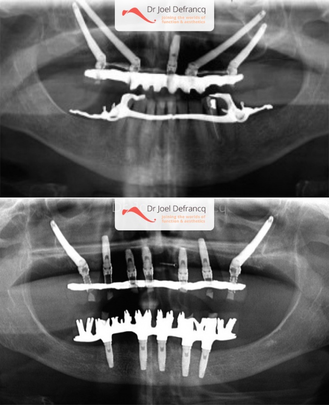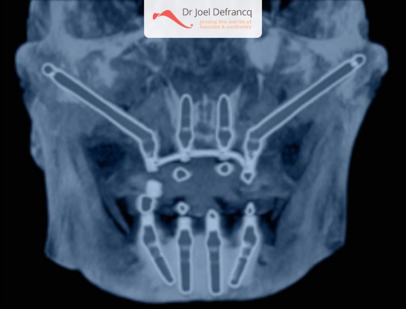 Er is inderdaad meestal nog wat bot aanwezig in het voorste deel van de bovenkaak recht onder het neusgebied. Indien er enkele (twee tot vier) reguliere implantaten kunnen worden geplaatst in het gebied van de voortanden, zal dr. Defrancq dit altijd doen. De sinussen zijn in de meer achtergelegen delen van de bovenkaak gelegen, en ten gevolge van de sinusuitbreiding is er daar vaak niet genoeg bot aanwezig. Dr. Defrancq plaatst daar twee zygoma-implantaten. Een rechtstreekse belasting volgt altijd op de ingreep en de patiënt heeft binnen een week vaste porseleinen of chroom-kobalt tanden.