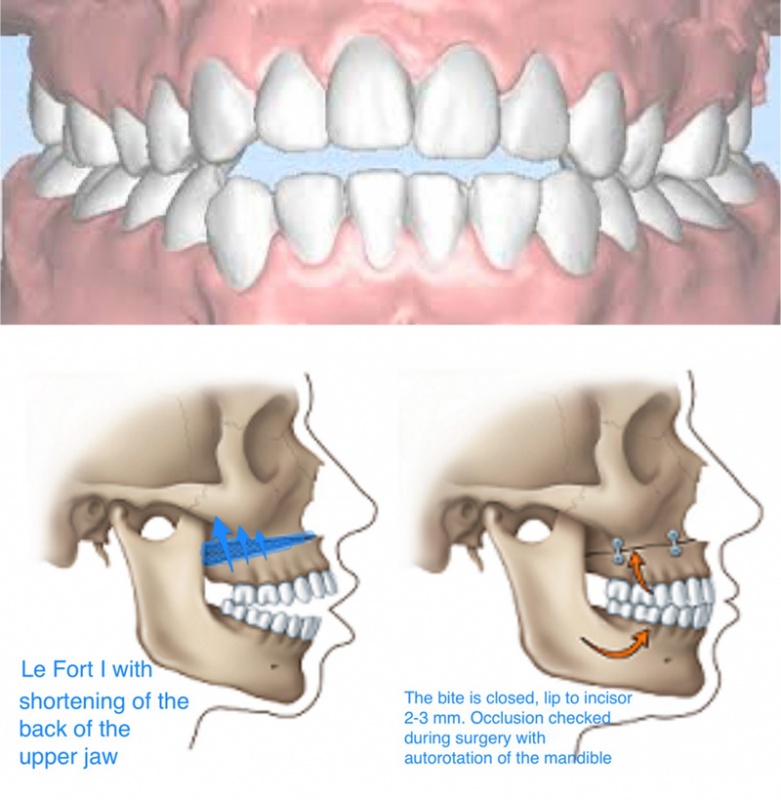 Het corrigeren van een open beet met behulp van orthodontie, maar zonder heelkunde, geeft vaak geen blijvende resultaten en leidt meestal tot recidief. Van zodra de corrigerende krachten van de beugel met elastieken worden verwijderd, hebben de tanden de neiging om zoals een veer terug te springen naar hun originele positie in open beet. De gouden standaard voor behandeling van een open beet is en blijft orthognatische heelkunde: Le Fort I ingreep.