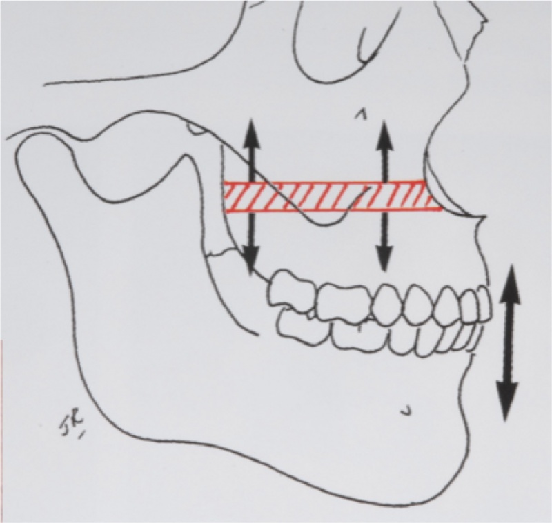 Orthognatische heelkunde is de meest effectieve behandeling om veranderingen aan te brengen in de inherente deficiënte gezichtsverhoudingen. De ingreep bestaat uit een Le Fort I extrusie (naar beneden kanteling) en gewoonlijk ook een bottransplantatie (uit de voorste heupkam). Eventueel kan een aanpassing van de onderkaak waar nodig ook aangewezen zijn ter correctie van de beet. Een extrusie genioplastie (kinverplaatsing naar beneden) is eveneens vaak aangewezen. Dit vormt een uitstekende indicatie voor orthognatische heelkunde en de resultaten na de ingreep zijn absoluut de moeite waard.