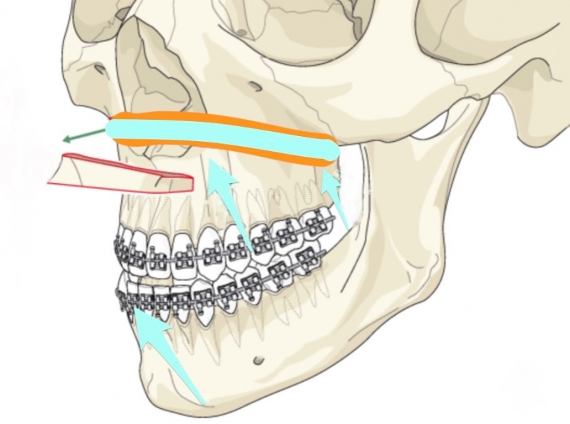De behandeling houdt orthognatische heelkunde in. Dit is een herpositionering van de bovenkaak, waarbij we deze moeten verhogen in vergelijking met de rest van het gezicht (Le Fort I intrusie osteotomie). De resultaten zijn zeker de moeite waard: de vorm van het gezicht wordt korter en de rusteloze indruk verdwijnt. Ook de lach krijgt een meer harmonieus uitzicht en de neus geeft ook meteen de indruk beter bij het gezicht te passen. Na correctie zal er een natuurlijke sluiting ontstaan van de boven- en onderlip.In geval van een Klasse II beet voeren we eveneens de voorwaartse verplaatsing van de onderkaak uit, en in geval van een Klasse III beet een achterwaartse verplaatsing. Heelkunde van de kin is ook vaak aangewezen tijdens onze tocht tot herstel van de harmonie in het lang gezicht.
